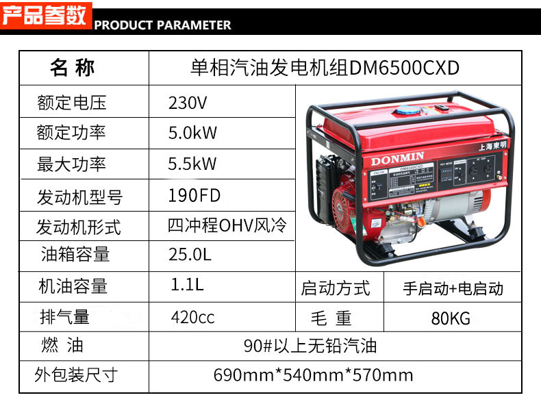 * 表示必填采購:5KW單相小型汽油發(fā)電機組【可配備移動輪】DM6500CXD